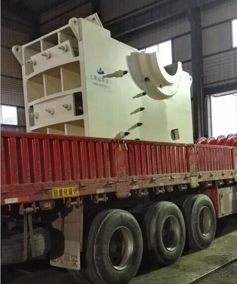 這是上周上海山卓重工的顎式破碎機(jī)的發(fā)貨現(xiàn)場(chǎng),這一臺(tái)設(shè)備是發(fā)往貴州六盤(pán)水的。這些照片都是小編用自己的手機(jī)隨手拍的,雖然光線不是很好,但也可以清晰的看到設(shè)備上我們上海山卓的標(biāo)志。這臺(tái)鄂破的型號(hào)是PE900*1200,屬于一個(gè)比較大的型號(hào),它的進(jìn)料口尺寸是900mm*1200mm,確實(shí)是一臺(tái)很大的設(shè)備!